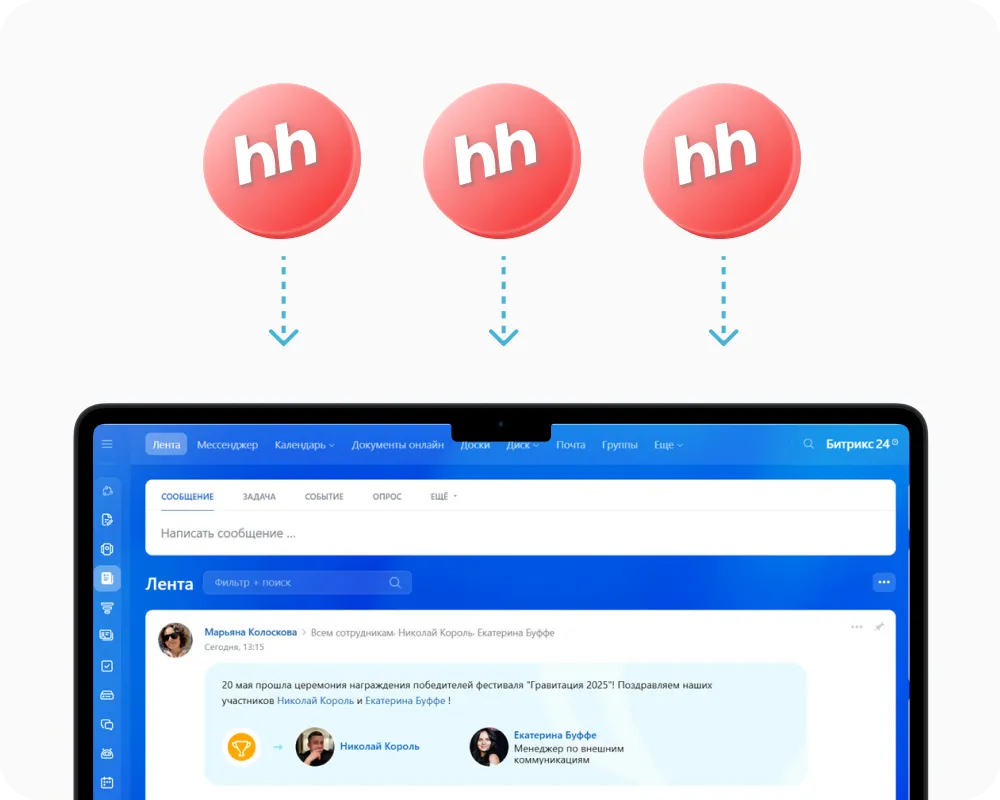 3. Заявка уходит hr, он размещает вакансию на hh.ru, и все заявки падают в Битрикс